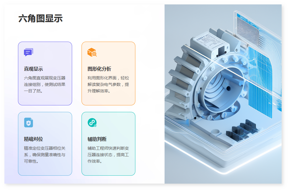 3·六角圖顯示功能:結(jié)果以數(shù)字和六角矢量圖顯示,直觀的看出變壓器連接組別情況。