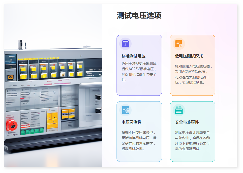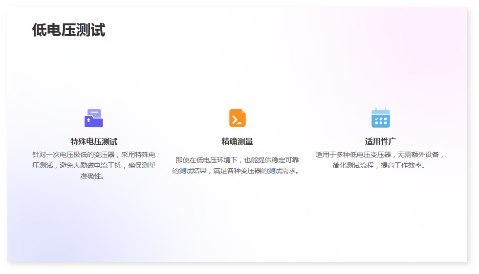 8·具有低輸入電壓變壓器專門測試功能,對于一次電壓很低的變壓器采用特殊電壓進行測試,避免勵磁電流太大而無法測試的情況。