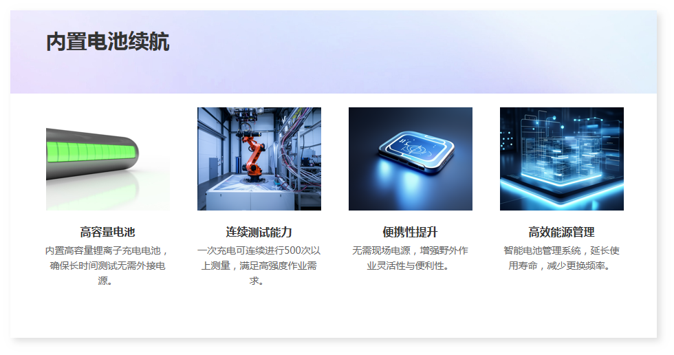 15·內(nèi)部配備高容量鋰離子充電電池,現(xiàn)場無需任何電源即可完成測試工作,一次充滿可以連續(xù)進行1000次以上的測量。
