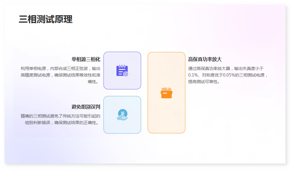 1·真正三相測試:單相電源輸入,內(nèi)部數(shù)字合成三相標(biāo)準(zhǔn)正弦波信號源,通過高保真功率放大器,產(chǎn)生三相測試電源(失真度小于0.1%、對稱度優(yōu)于0.05%)輸出,測試結(jié)果具有更好的等效性,不會出現(xiàn)組別誤判等現(xiàn)象。