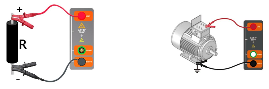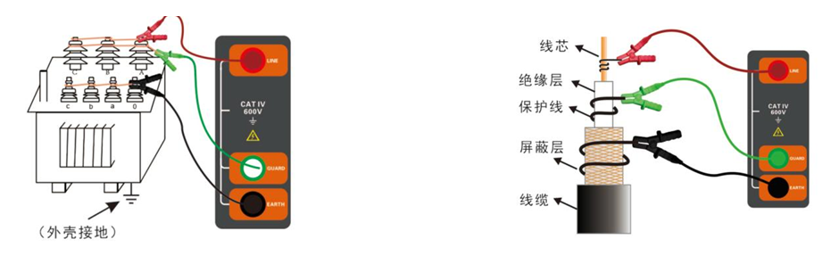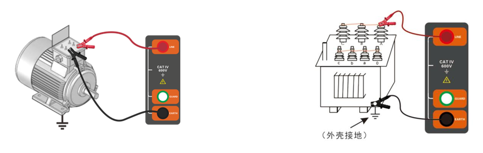 E接線端:"E"稱為地端,接至被測物的地、零端。例如電機外殼金屬、變壓器鐵芯、電纜屏蔽層