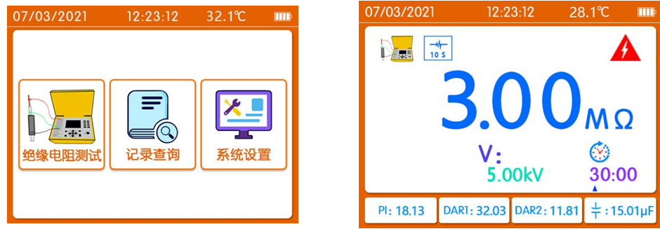 絕緣電阻測試、試品電容測試、極化指數和吸收比的自動計算、自動放電功能、環(huán)境溫度顯示、濾波功能、時鐘功能