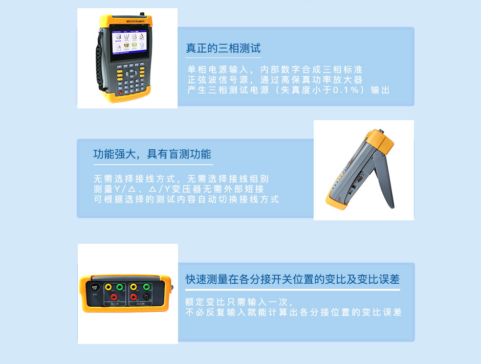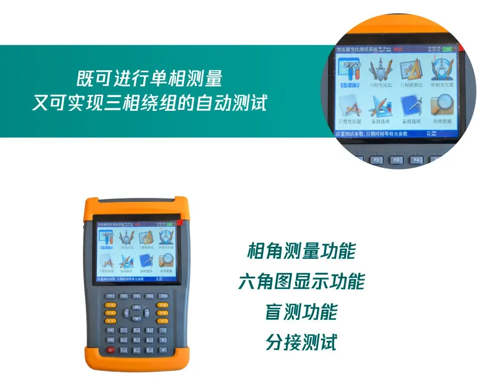 2·我公司自主開發(fā)、研制生產(chǎn)的多功能手持式全自動變比測試儀除具有完全根據(jù)用戶的現(xiàn)場使用要求,操作簡便,功能完備,數(shù)據(jù)穩(wěn)定可靠的特點外還是國內(nèi)到目前為止第一款可以進行盲測(不知道被測變壓器的任何銘牌參數(shù)的情況下準確測量變比值和組號,同時能準確測量相角)的手持式變比測試儀;