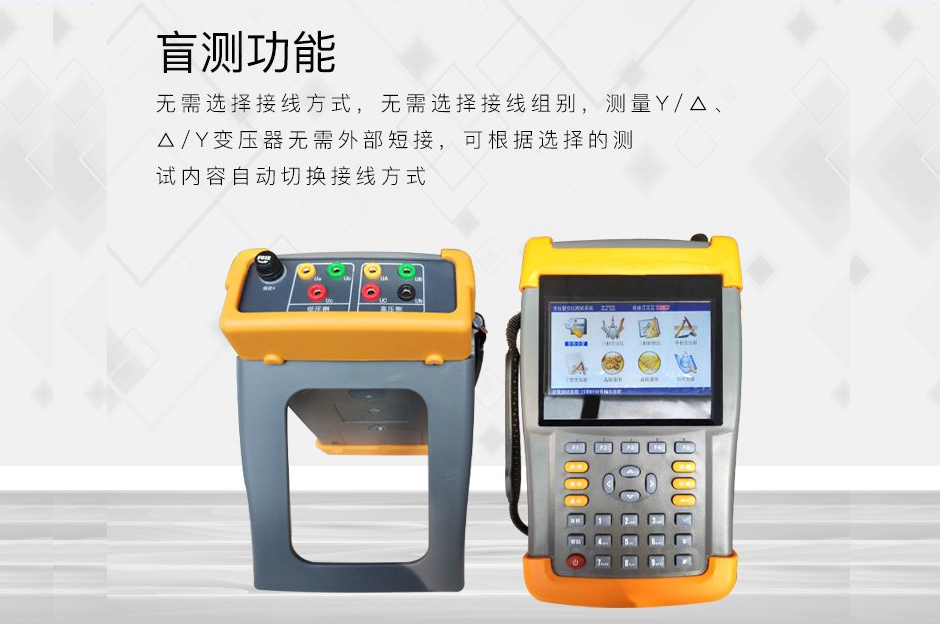 4、盲測功能:無需選擇接線方式,無需選擇接線組別,測量Y/△、△/Y變壓器無需外部短接,可根據(jù)選擇的測試內(nèi)容自動切換接線方式。完全可以對沒有銘牌的變壓器進行變比和組號的測量。