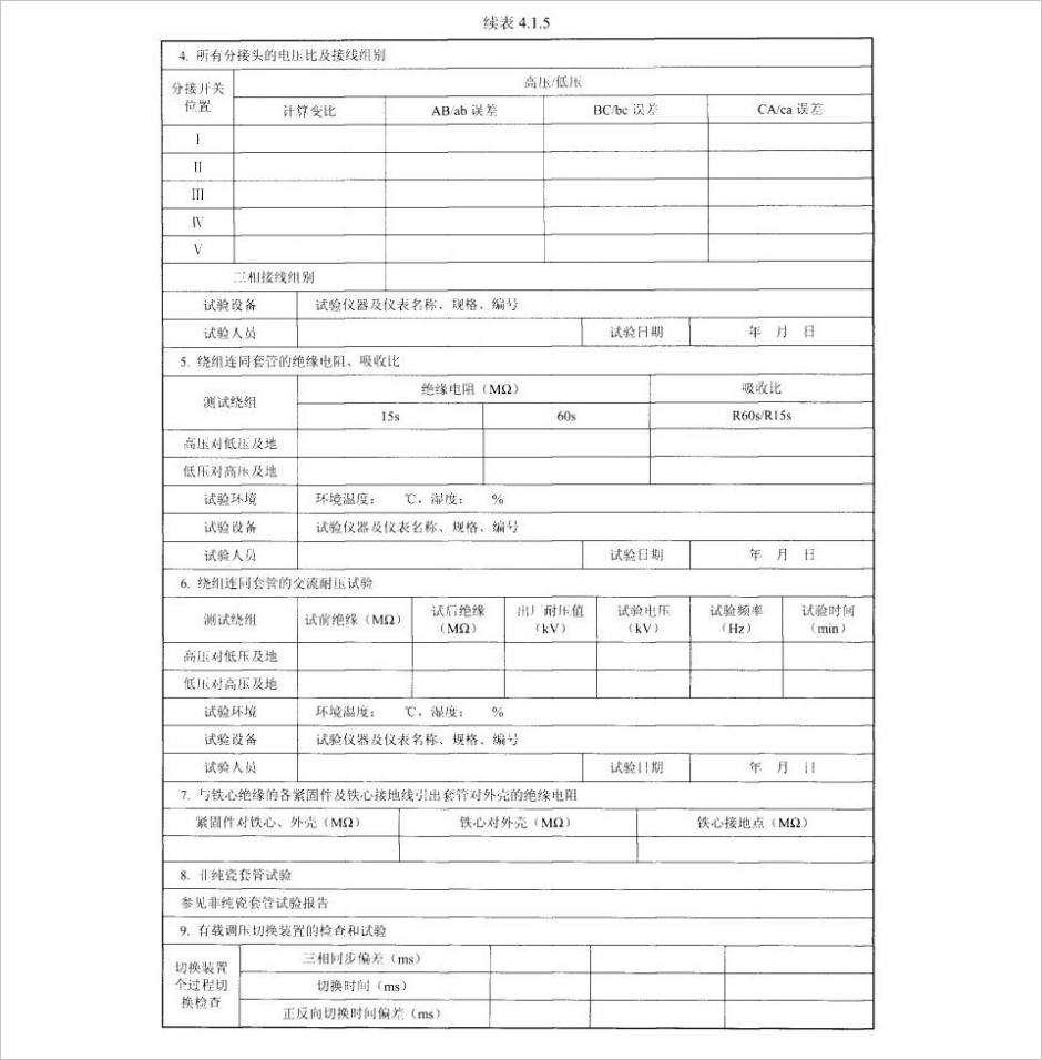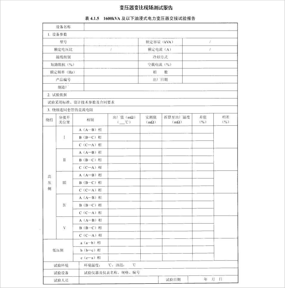 5、分接測試:能快速測量在各分接開關位置的變比及變比誤差,額定變比只需輸入一次,不必反復輸入就能計算出各分接位置的變比誤差。