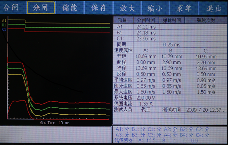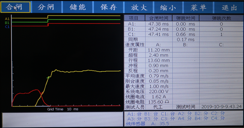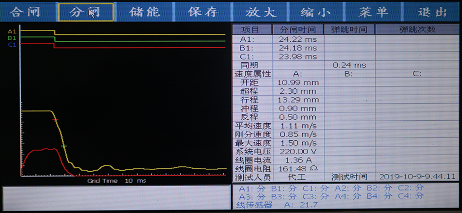6、開關(guān)動(dòng)作一次,得到所有數(shù)據(jù)及圖形,測試數(shù)據(jù)和圖形同屏顯示,速度可進(jìn)行再計(jì)算,無需再測試。