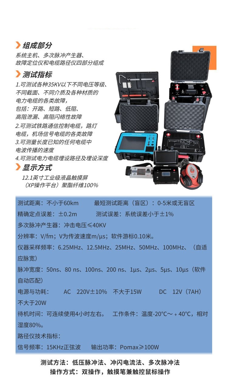 整套設(shè)備由電纜故障測(cè)試儀主機(jī)、電纜故障測(cè)試附件(路徑儀和定點(diǎn)儀)和電纜測(cè)試高壓?jiǎn)卧肮ゎl耐壓裝置組成,測(cè)試簡(jiǎn)單方便