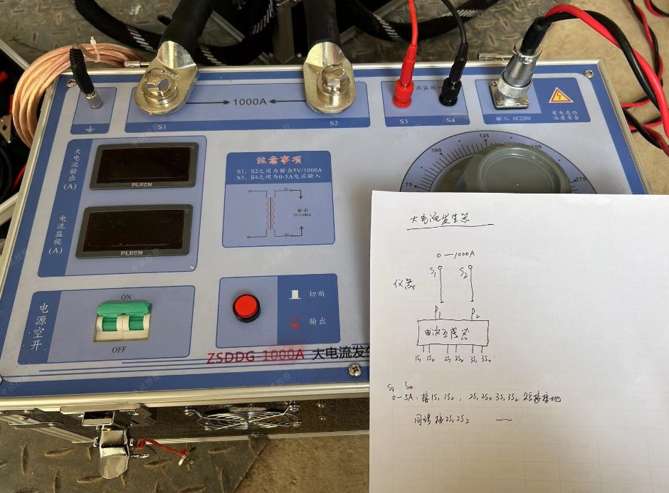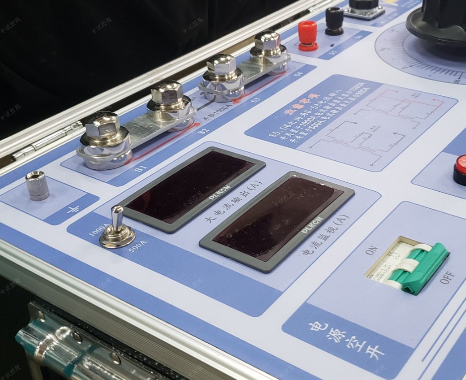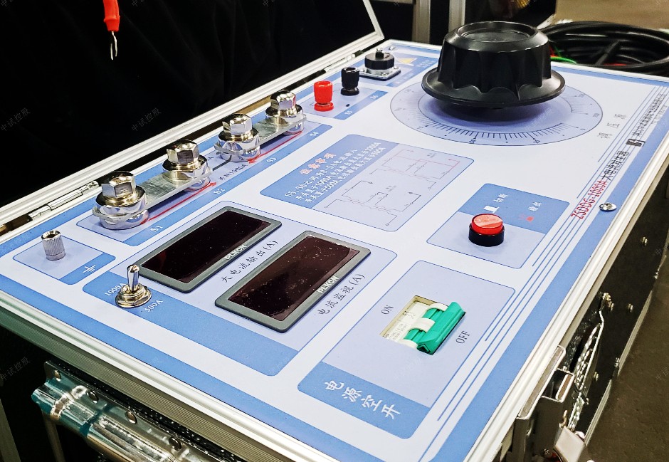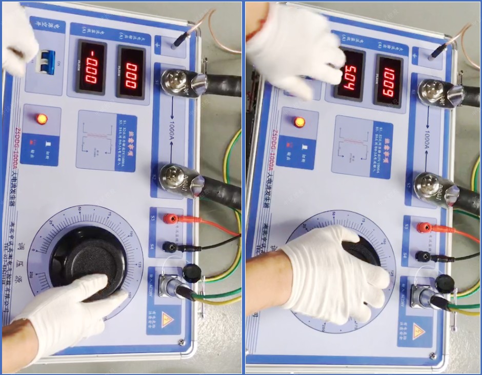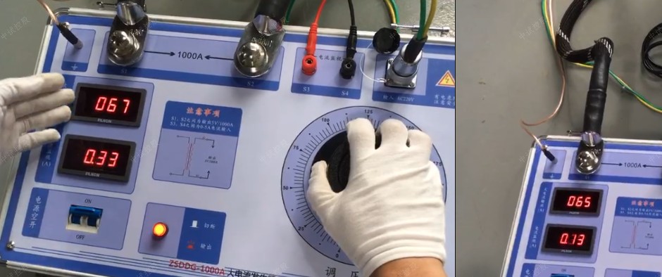 3.合上電源空開,按下紅色輸出按鈕,通過調(diào)壓旋鈕來達(dá)到預(yù)期輸出電流值,此時(shí)可通過大電流輸出表觀測所升電流值。