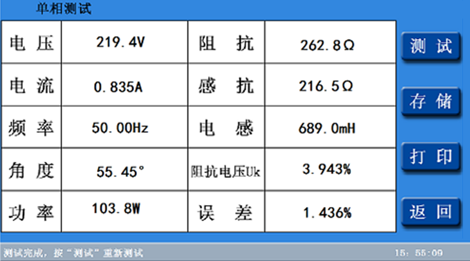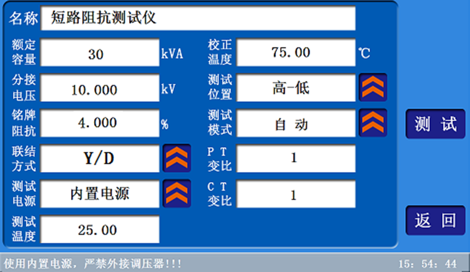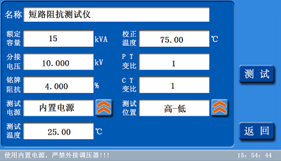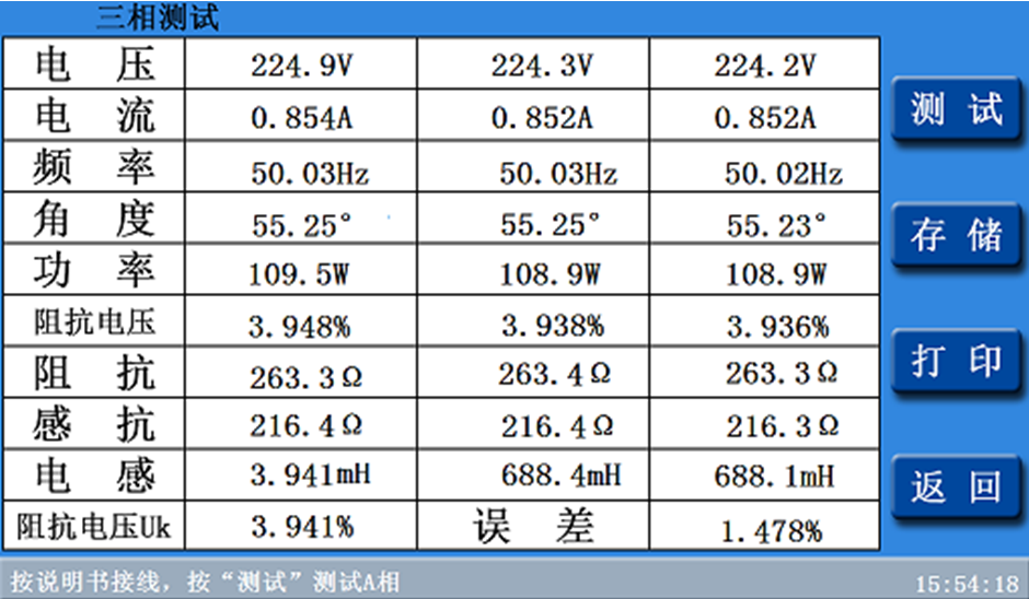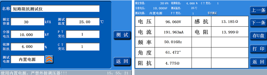 2.三相短路阻抗的測量:顯示三相電壓、三相電流、三相功率;自動計算出變壓器折算到額定溫度、額定電流下的阻抗電壓百分比,以及與銘牌阻抗的誤差百分比。