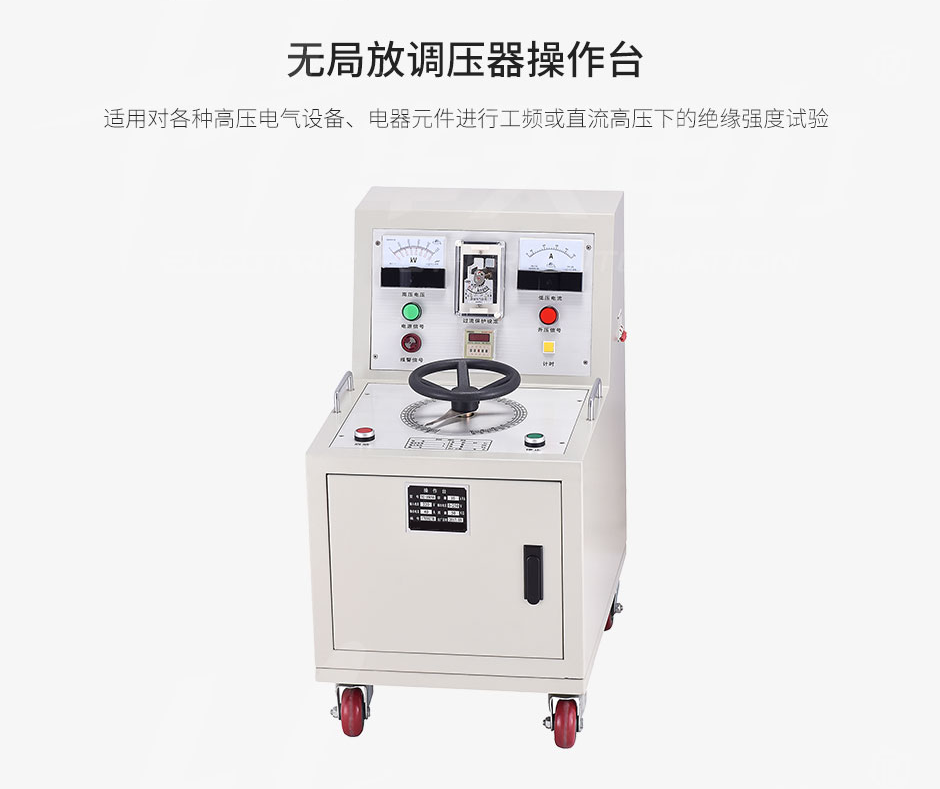 1、控制臺為無局放高壓試驗變壓器的配套控制調(diào)壓裝置,手動升壓,數(shù)顯表計,高壓電壓指示、低壓電流指示、耐壓計時指示、耐壓計時整定、過流保護、過流保護整定、零位啟動保護等